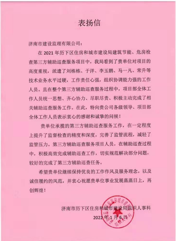 點(diǎn)贊!公司第三方輔助巡查服務(wù)團(tuán)隊(duì)獲歷下區(qū)住房和城市建設(shè)局組織人事科來(lái)信表?yè)P(yáng)